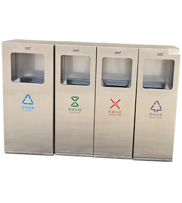 深圳新標(biāo)準(zhǔn)城中村街道社區(qū)不銹鋼五分類垃圾桶由有害垃圾、玻璃、金塑紙(為金屬、塑料、紙張的簡(jiǎn)稱)、廚余垃圾、其他垃圾這5分類不銹鋼垃圾桶組合而成。其中金塑紙、其他垃圾日常產(chǎn)生量較大,所以分類收集容器也